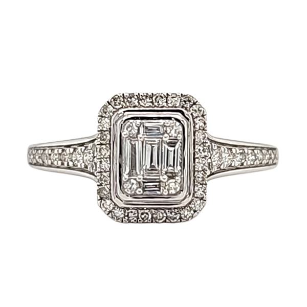9ct white gold diamond ring with halo, Baguette and round brilliant cut diamonds.